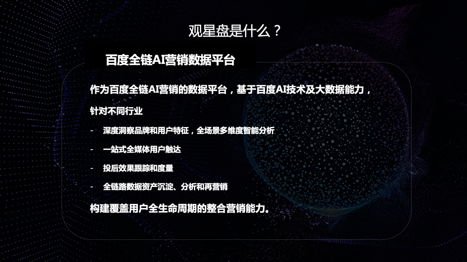 观星盘,作为N.E.X.T.百度全链AI营销的智能数据平台,基于百度AI技术及大数据能力,针对不同行业深度洞察品牌和用户特征,全场景多维度智能分析;一站式全媒体用户触达n投后效果跟踪和度量;全链路数据资产沉淀、分析和再营销,构建覆盖用户全生命周期的整合营销能力。
